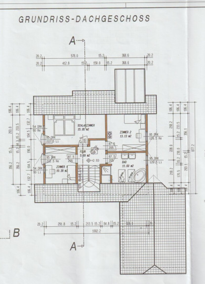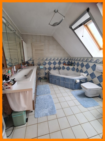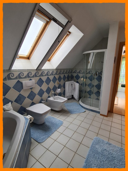 OG: 3 Zimmer, 1 begehbarer Schrankraum, großes Badezimmer mit Badewanne, extra Dusche, Bidet, WC, hochwertigen Fliesen von Villeroy & Boch Design Titanic.