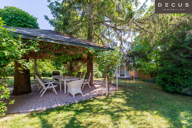 Die weitläufige Gartenfläche ist eine wahre Oase: großzügige Grünflächen mit altem Baumbestand, überdachte Terrassen für entspannte Stunden im Freien, ein Pavillon für Sommerabende, ein Grillplatz sowie ein Gartenhaus für praktischen Stauraum. Dieser Außenbereich vereint Naturidylle mit exklusiven Annehmlichkeiten und bietet vielfältige Gestaltungsmöglichkeiten.
