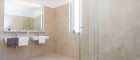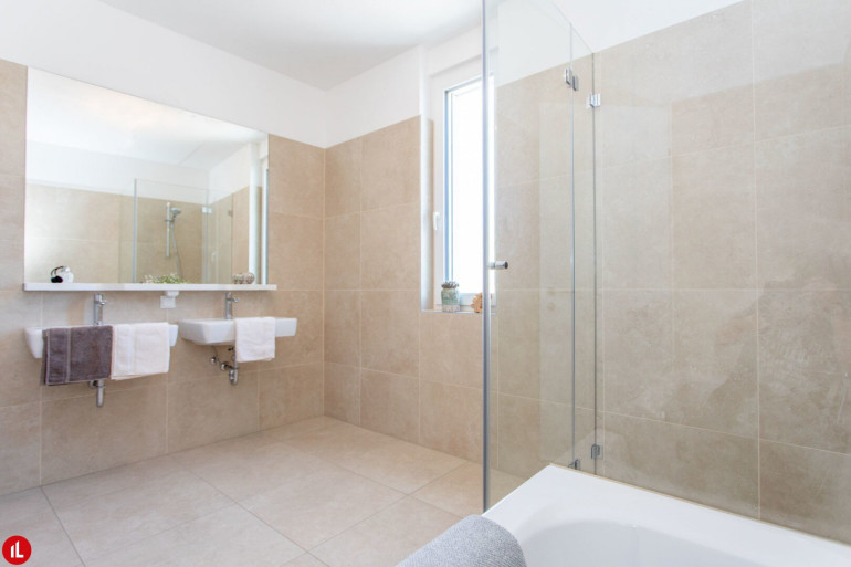 - elegant verfliestes Badezimmer mit Badewanne, Dusche, 2x Waschbecken und Fenster