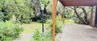Sonniger Garten mit altem Baumbestand, Terrasse und Holzschuppen