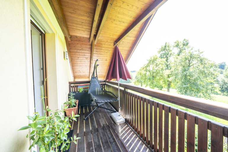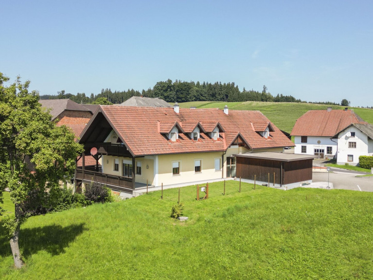 Das Wohnhaus mit zwei getrennten Wohneinheiten samt Lagerräumen im Untergeschoß schließt an den Innenhof des Landgasthofes an und bildet eine Einheit. Beide Wohneinheiten sind durch ein zentrales Stiegenhaus erschlossen. Die Einheit im EG bietet drei Zimmer, eine große Einbauküche, Bad und WC sowie einen großen Richtung Süden ausgerichteten Balkon mit Blick ins Grüne bis hin zur Bergwelt des Salzkammerguts. Die Wohnung im Dachgeschoß besteht aus fünf Zimmern samt voll ausgestatteter Einbauküche, Bad und WC getrennt sowie einem überdachten Südbalkon.