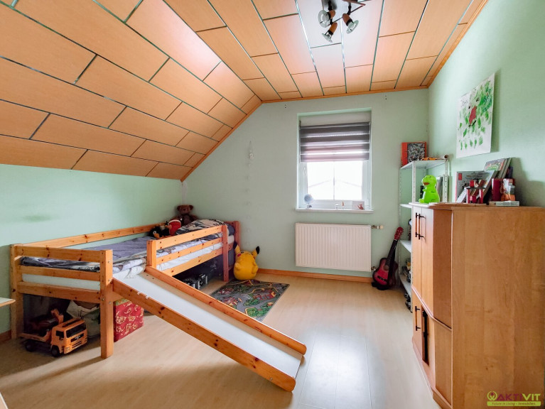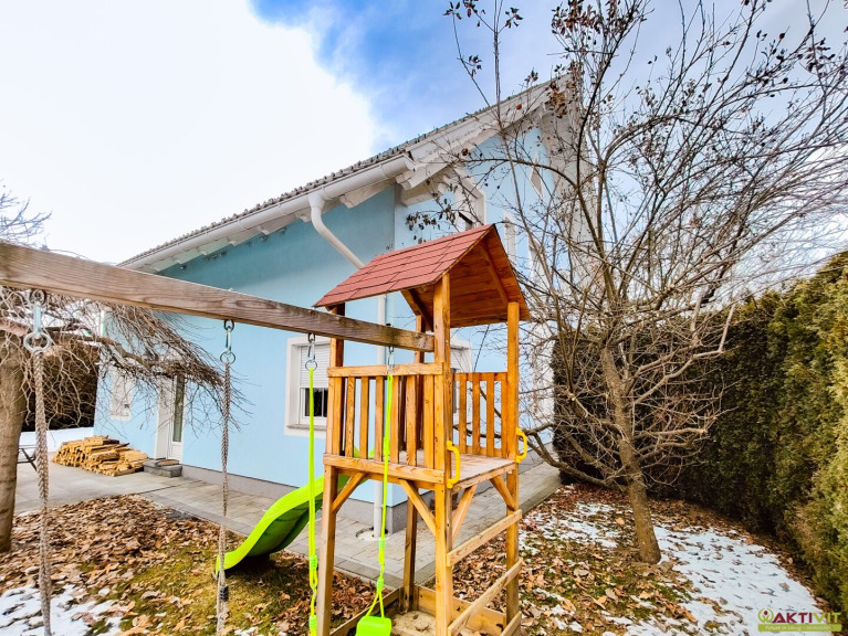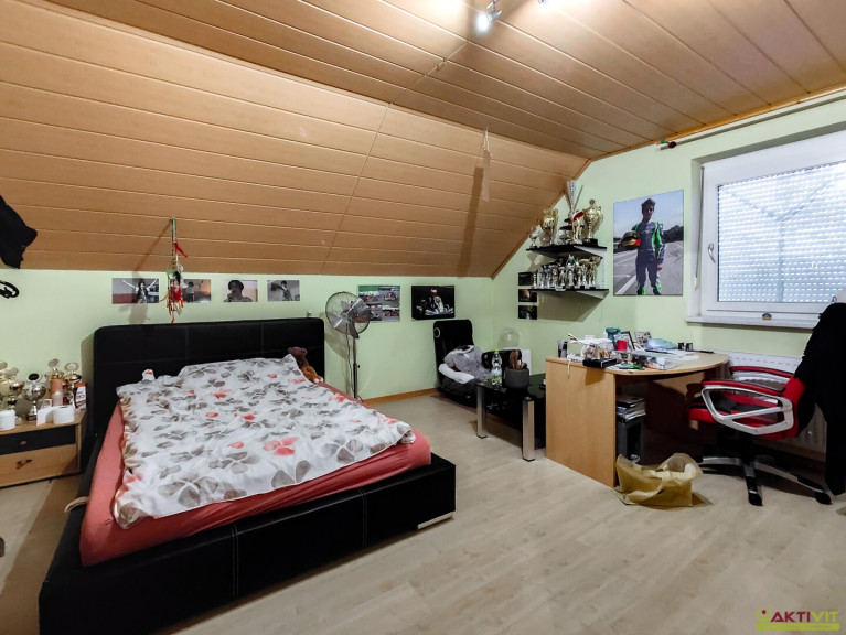 Die Wohnfläche beträgt ca. 177 m² und liegt im Erdgeschoss und Dachgeschoss. Im Erdgeschoss gelangt man über einen Windfang in einen zentralen Gang, der das Badezimmer mit WC, den Treppenabgang in den Keller sowie das Esszimmer erschließt. Vom Esszimmer aus sind das Wohnzimmer, die Küche mit angrenzender Speis sowie der direkte Zugang in den Garten erreichbar. Im Dachgeschoss befindet sich ein zentraler Flur, von dem drei Schlafzimmer, ein Badezimmer, ein separates WC sowie ein Westbalkon zugänglich sind. Eines der Schlafzimmer bietet zudem einen Zugang zum Dachboden des Garagenhauses.