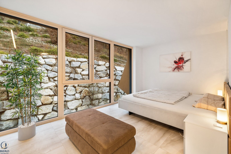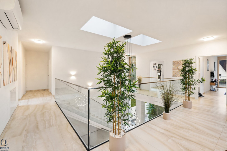 Im Obergeschoss befinden sich drei hochwertig ausgestattete Schlafzimmer, jeweils mit eigenem Balkon und großflächigen Fensterfronten, die einen herrlichen Ausblick in die grüne Umgebung bieten. Weiters finden sie einen Abstellraum und einen begehbaren Schrankraum vor. Ein besonderes Highlight bildet die helle und offene Galerie sowie die großzügige Masterbedroom-Suite mit en-suite Badezimmer und privatem Balkon. Von hier aus eröffnet sich ein beeindruckender Blick auf Garten, Pool, Sonnendeck und die umliegende Landschaft.