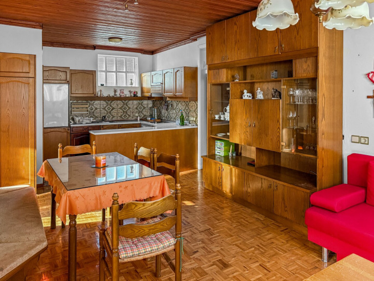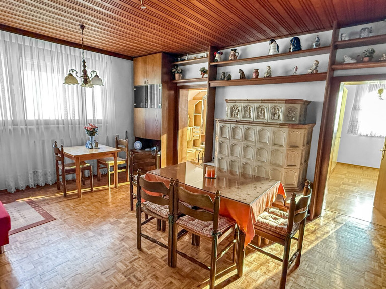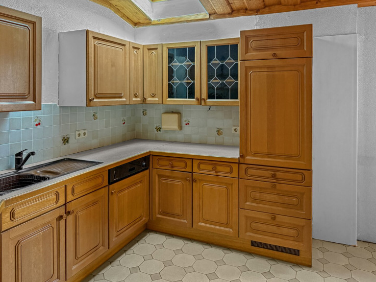 Schon beim Betreten empfängt Sie ein weitläufiger Flur mit Garderobe, von dem aus Sie sämtliche Räume des Erdgeschosses erreichen, sowie die Treppe ins Obergeschoss und den Zugang zum Keller. Die Küche mit praktischer Speisekammer und offenem Essbereich bildet das Herz des Hauses – hier entstehen lebendige Momente mit Familie und Freunden. Vier weitere Zimmer, ein Badezimmer mit Dusche und Handwaschbecken sowie ein separates WC bieten Komfort und Flexibilität. An kalten Tagen sorgt der Kachelofen im Wohn-Esszimmer und in zwei Schlafzimmern für wohlige Wärme – ein Ort, an dem man sich einfach fallenlassen kann.