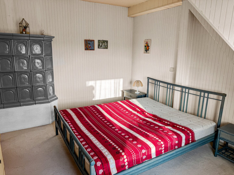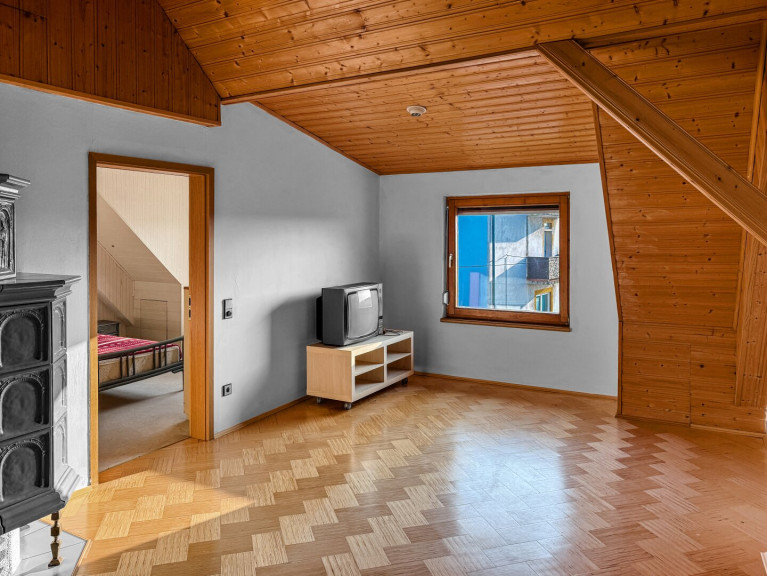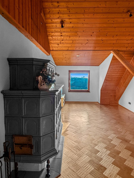 Das 1987 ausgebaute Dachgeschoss mit fast 80 m² Wohnfläche überrascht mit einer zweiten Küche samt Essbereich, einem großzügigen Wohnzimmer, einem gemütlichen Schlafzimmer und einem kleinen, komfortablen begehbaren Kleiderschrank. Auch hier sorgt ein großer Kachelofen für behagliche Wärme, die sich über Wohnzimmer, Küche, Esszimmer und Schlafzimmer erstreckt. Das Badezimmer mit Dusche, Badewanne, WC und Anschluss für zwei Handwaschbecken lädt zum Entspannen ein. Zudem bietet der fast 60m² große Rohdachboden, aufgeteilt in zwei Zimmer, noch Potenzial für zusätzlichen Wohnraum - ideal, wenn Sie den Platz für eine größere Familie oder eine separate Wohneinheit brauchen. In einem der beiden Räume ist bereits eine Türvorrichtung, wenn hier noch eine Treppe nach außen errichtet wird, kann diese Wohneinheit mit eigenem Eingang komplett separat genutzt werden für maximale Privatsphäre und Unabhängigkeit.