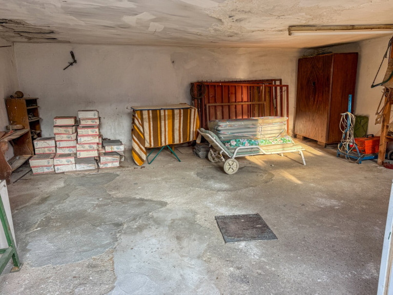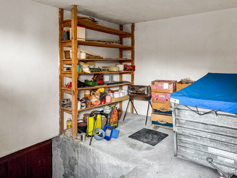 Auf der Rückseite des Grundstücks befindet sich ein praktisches Nebengebäude mit zwei Räumlichkeiten: Eine großzügige Garage mit einer integrierten Mechanikergrube, ideal für Autoliebhaber oder handwerkliche Projekte. Daneben ein weiterer Einlagerungsraum, der zusätzlichen Stauraum für Gartengeräte, Fahrräder oder saisonale Gegenstände bietet.
