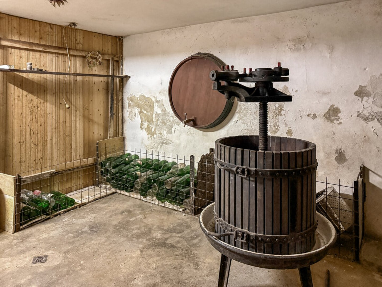 Zusätzlich gibt es einen Waschraum mit Dusche, Handwaschbecken und Toilette – praktisch und komfortabel für den Alltag. Ein weiteres Highlight ist der ehemalige Weinpresskeller, in dem sich heute eine alte Weinpresse befindet, die an die lange Weintradition der Region erinnert und dem Keller eine besondere Atmosphäre verleiht. Den Keller erreichen Sie bequem entweder direkt vom Vorraum im Wohnhaus oder über den Hof mit eigenem Zugang. Zusätzlich steht Ihnen ebenerdig ein separater Raum zur Verfügung, der derzeit als praktischer Abstellraum genutzt wird.