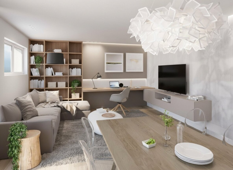 Herzstück der Wohnung ist der weitläufige Wohn-Koch-Essbereich, der durch seine offene Planung und große Fensterflächen überzeugt. Von hier aus gelangt man direkt auf die zwei Terrassen, die viel Platz für Entspannung, gesellige Stunden und den Genuss der schönen Weitsicht bieten.