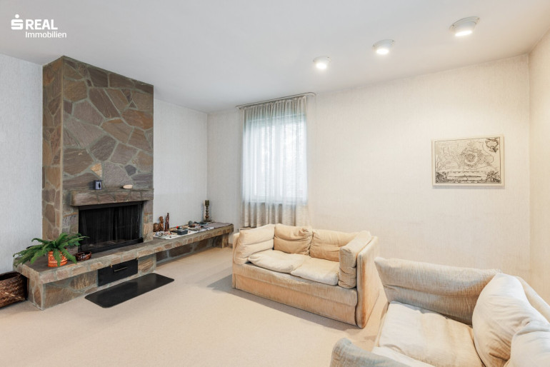 Im Wohnzimmer dominiert ein "freistehender Kamin", ein toller Blickfang - der aber nicht nur optisch überragend wirkt - sondern auch in der Übergangszeit wohlige Wärme spendet.