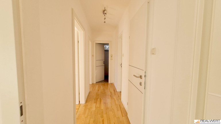 Die Wohnung befindet sich im Hochparterre. Von der Diele aus gelangt erschließen sich Küche und Wohnzimmer. Die Küche ist neuwertig und verfügt über einen Herd mit Ceranfeld sowie Dunstabzug und Geschirrspüler. Über das Wohnzimmer, von welchem aus der Süd-Balkon zugänglich ist, erschließen sich über einen Gang die weiteren Zimmer und das Bad. Sämtliche Wohnräume sind mit Parkettböden ausgeführt. Das Badezimmer ist gefliest.