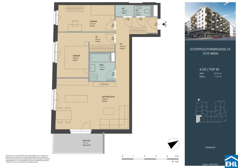 Fliesen, Parkett, Fußbodenheizung, Wohnküche / offene Küche, Personenaufzug, Badewanne