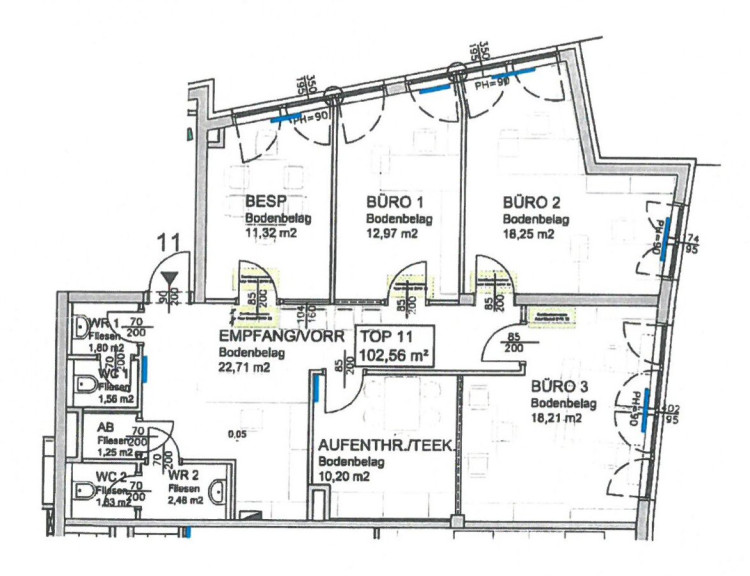 Hinweis: Die Raumaufteilung des zur Verfügung gestellten Plans entspricht nicht den örtlichen Gegebenheiten, sondern der Textbeschreibung! Die Raumaufteilung ist (je nach Mietdauer) frei veränderbar. Derzeit fehlt die Trennwand zwischen den Büros 1 & 2, das Büro 3 ist über das Büro 1 & 2 erreichbar, nicht jedoch durch den Gang, und die Teeküche ist auch über das Büro 3 erreichbar.