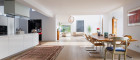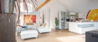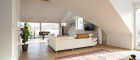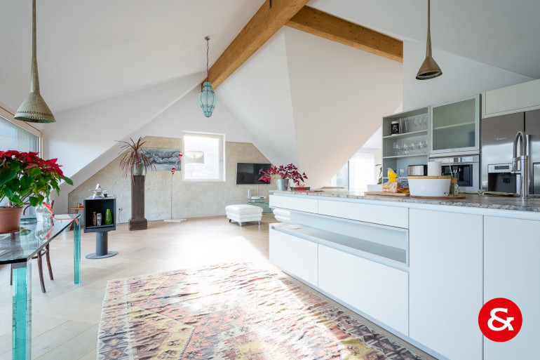 Sämtliche Böden in den Wohnbereichen sind mit starken, bis zu sieben Meter langen Eichendielen, belegt - im Dachgeschoß wirkt der Eichenboden, der im "Fischgrätverband" großflächig verlegt ist, besonders modern.