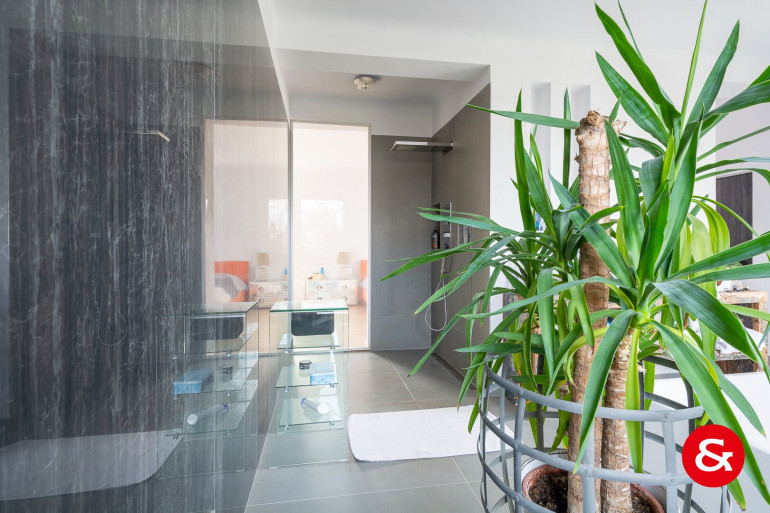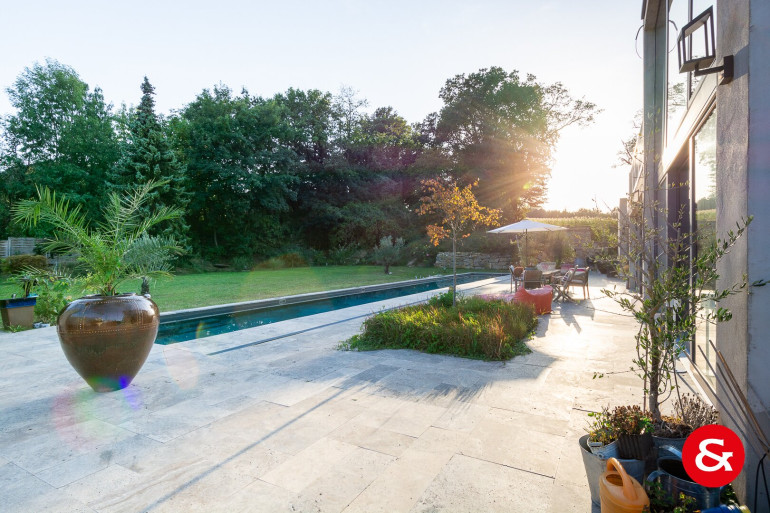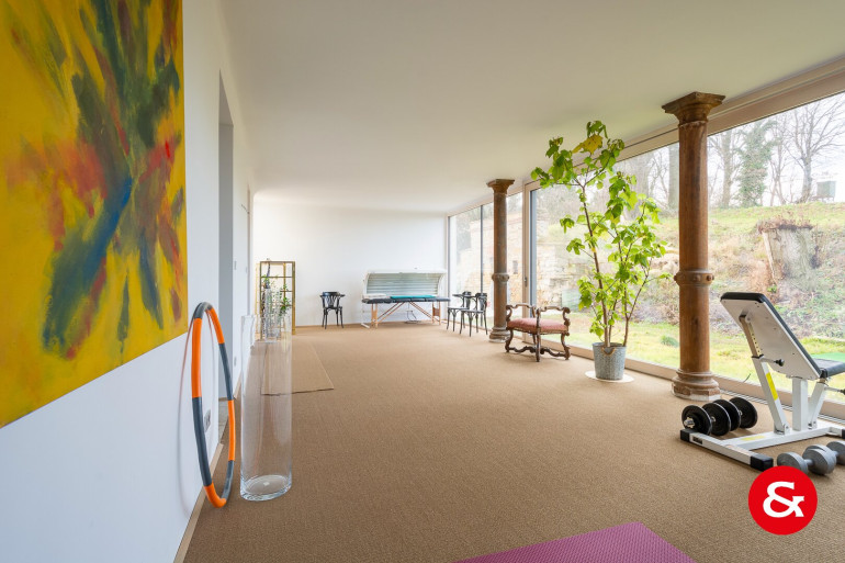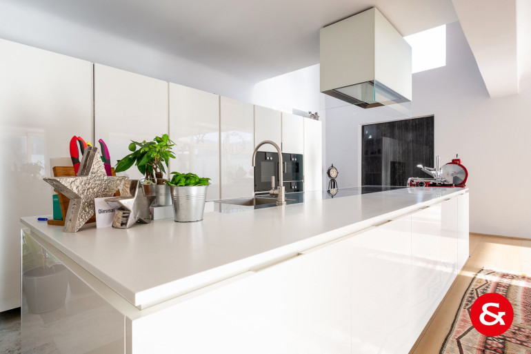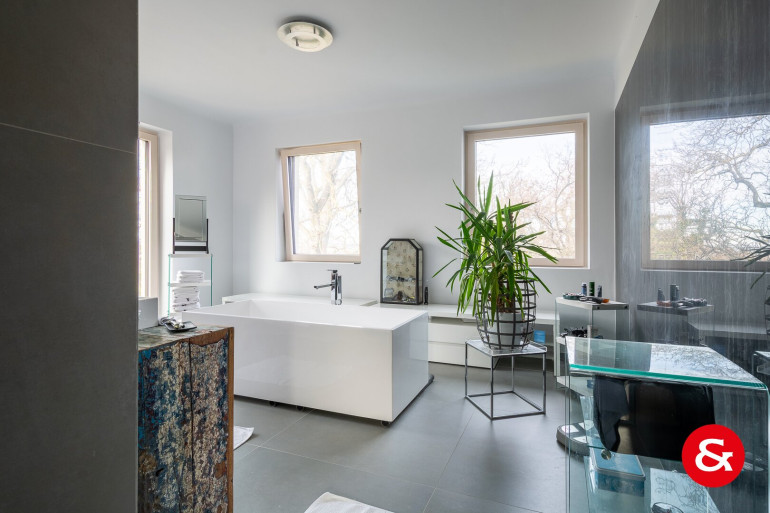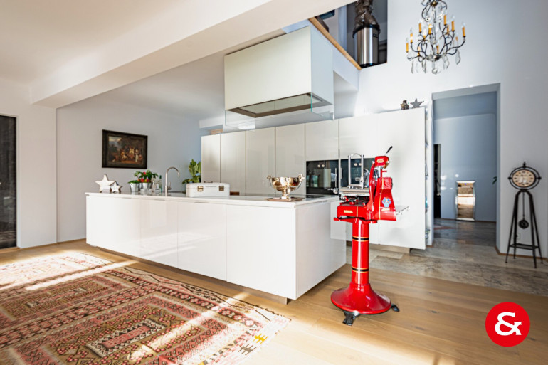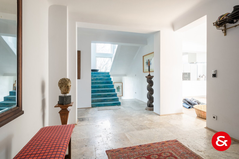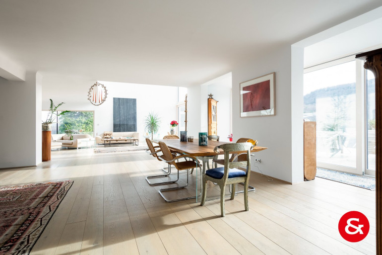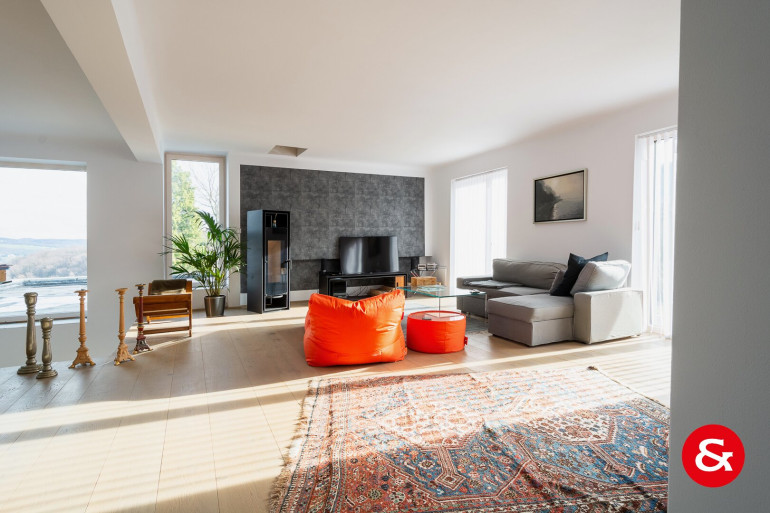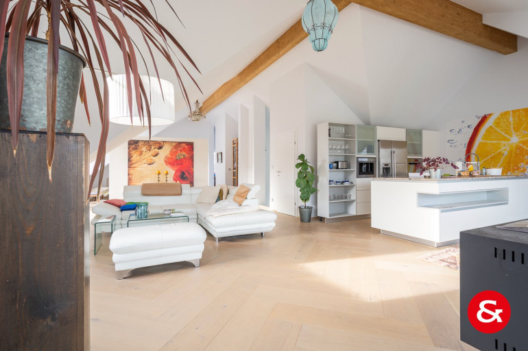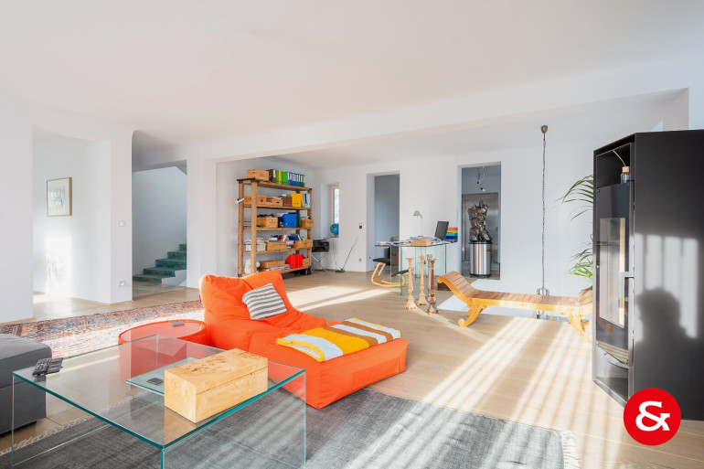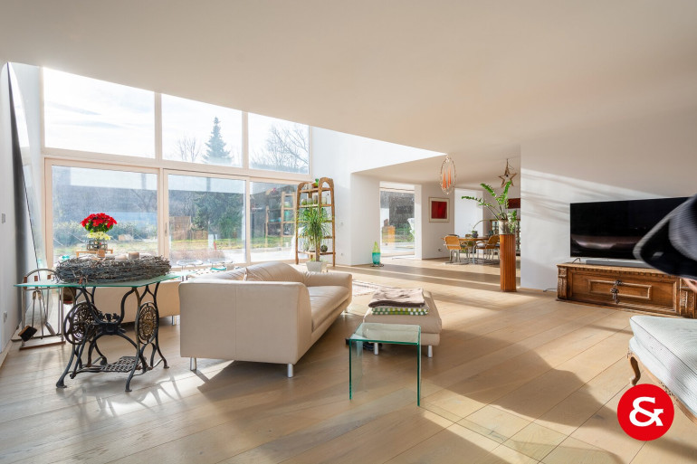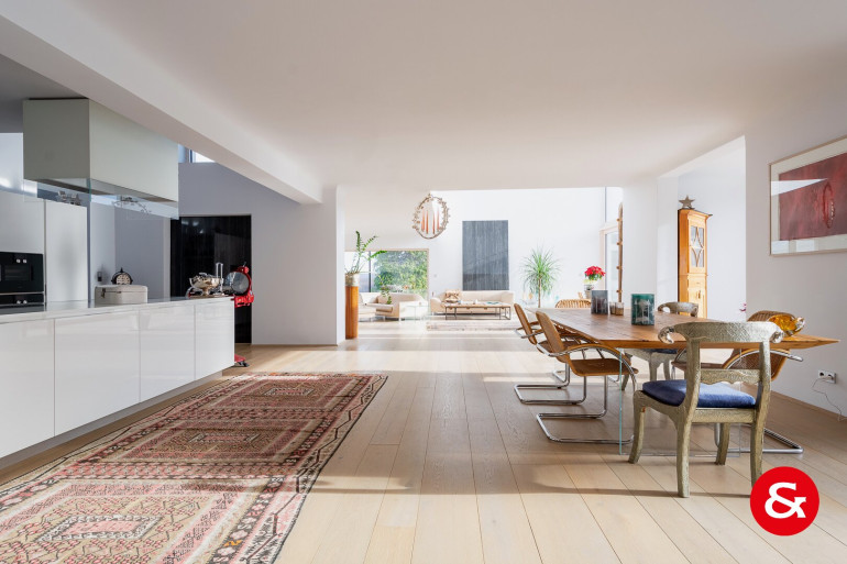 In einem Bereich von etwa 450 m² Wohnfläche, der sich über drei Ebenen erstreckt, befindet sich dieses sehr repräsentative und von natürlichem Licht durchflutete Wohnambiente.