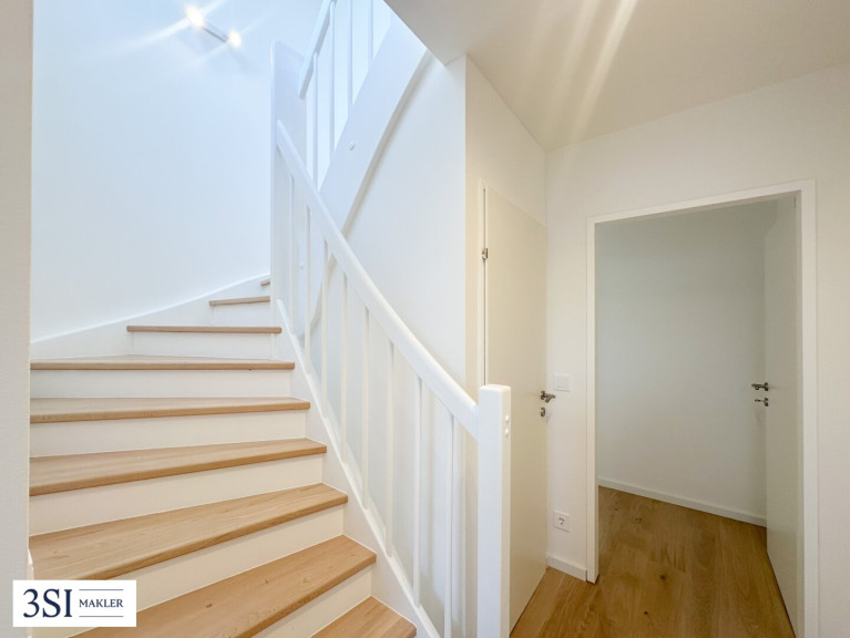 Über eine stillvolle Treppe gelangt man in das obere Geschoss, wo sich ein weiteres Zimmer mit Badezimmer inklusive Badewanne und WC befindet. Von hier aus erreichen Sie auch die Terrasse, die zum Entspannen einlädt und besonders in den Abendstunden mit wundervoller Sonne begeistert.