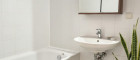 Das Badezimmer ist mit einer Badewanne, einem Waschtisch sowie einem Waschmaschinenanschluss ausgestattet. Ein separates WC sorgt für zusätzlichen Komfort.