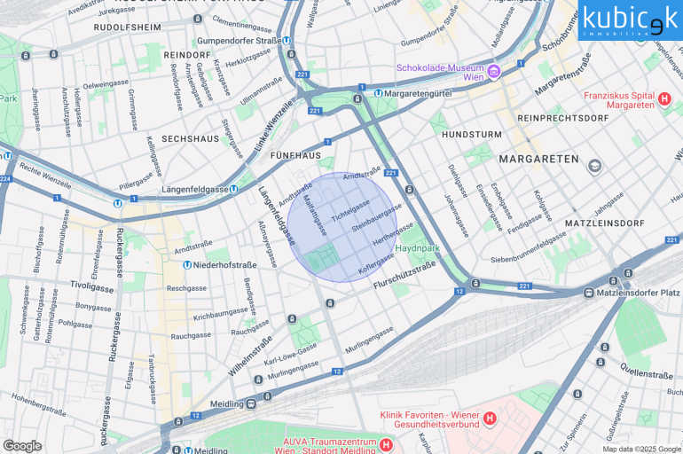 Die Wohnung befindet sich in einer ausgezeichnet angebundenen und urbanen Lage des 12. Bezirks, nur rund 10 Gehminuten von den U-Bahn-Stationen Längenfeldgasse (U4, U6) sowie Margaretengürtel (U4) entfernt. Damit stehen Ihnen zwei wichtige Linien zur Verfügung, die eine schnelle und direkte Verbindung sowohl ins Stadtzentrum als auch in andere Teile Wiens gewährleisten. Ergänzend zu den U-Bahnen befinden sich die Straßenbahnlinie 12A sowie die Buslinie 59A in unmittelbarer Nähe. Der Bus 59A bringt Sie bequem in etwa 8 Minuten zum Verkehrsknotenpunkt Bahnhof Meidling (U6, S-Bahn) oder in rund 13 Minuten direkt ins Wiener Stadtzentrum zur Oper bzw. zum Karlsplatz. Die hervorragende öffentliche Anbindung macht diese Lage besonders attraktiv für Pendler und Stadtliebhaber. Auch die Nahversorgung ist hier optimal: Mehrere Supermärkte wie Billa, Eurospar und Interspar liegen nur wenige Gehminuten entfernt, ebenso Drogeriemärkte wie Dm. Ärzte, Apotheken sowie diverse Bildungs- und Betreuungseinrichtungen befinden sich im näheren Umfeld und sorgen für eine umfassende Infrastruktur, die den Alltag angenehm und unkompliziert macht. Für Freizeit und Erholung bietet die Umgebung einen besonderen Höhepunkt: In nur zwei U-Bahn-Stationen erreichen Sie das prachtvolle Schloss Schönbrunn mit seinem weitläufigen Schlosspark. Dieser zählt zu den beliebtesten Erholungsgebieten Wiens und beeindruckt mit kunstvollen Brunnen, historischen Statuen, prachtvollen Gartenanlagen und weitläufigen Spazierwegen. Seit 1996 gehört das Ensemble aus Schloss und Park zum UNESCO-Weltkulturerbe. Die Lage verbindet somit Urbanität, hervorragende Infrastruktur und schnelle Erreichbarkeit von Kultur- und Erholungsangeboten – ein idealer Standort für komfortables Wohnen in Wien.
