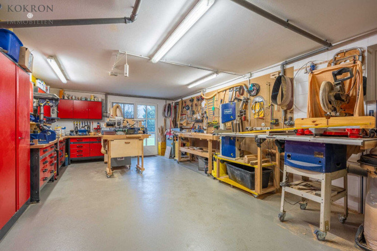 An das Wohnhaus angebunden sind Garage und Werkstätte, die beiden Räume sind durch eine flexible Raumtrennung unterschiedlich in der Größe nutzbar, die Werkstätte z.b. auch als weitere Garage. Sie gelangen von der Garage/Werkstätte sowie vom Haupteingang in das Wohnhaus.