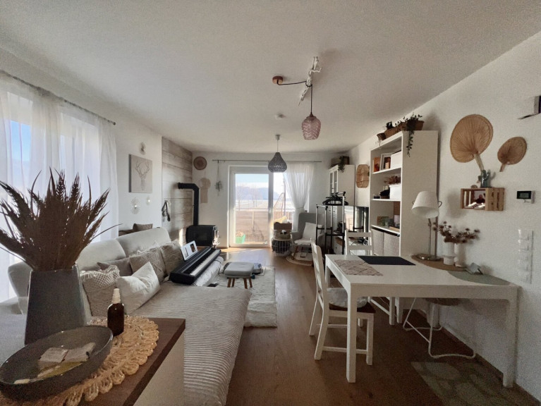 Der helle, großzügige Wohnbereich bildet das Herzstück der Wohnung und lädt zum Entspannen ein. Ein hochwertiger Kaminofen (7 kW) schafft nicht nur eine besonders behagliche Atmosphäre, sondern bietet mit integrierter Herdplatte auch ein Plus an Unabhängigkeit – ideal in Zeiten steigender Energieunsicherheit.
