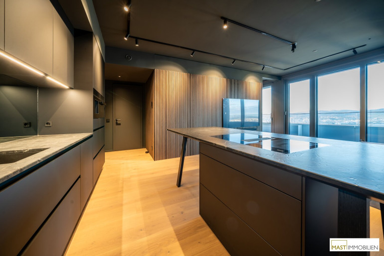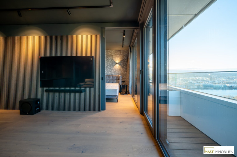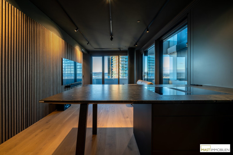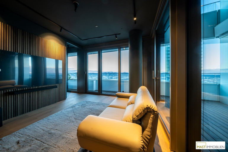 Diese außergewöhnliche, voll möblierte Wohnung im 40. Stock der DANUBEFLATS bietet ein Wohnerlebnis auf internationalem Niveau. Auf einer Wohnfläche von 66,95 m², ergänzt durch einen 8,35 m² großen Balkon sowie eine 11,51 m² Loggia mit 6,52 m² Wintergarten, eröffnet sich ein spektakulärer Panoramablick auf die Donau und den Kahlenberg.