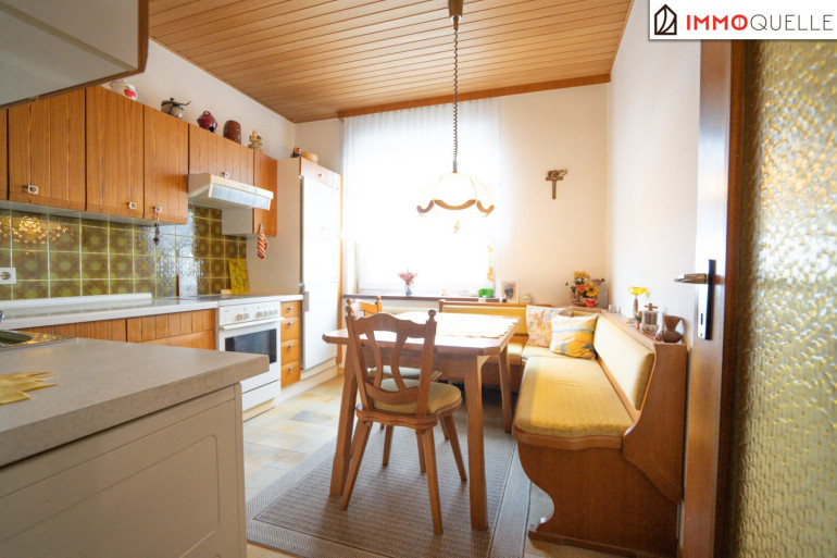 Geradeaus eröffnet sich die nordseitig ausgerichtete Küche mit Fenster - funktional ausgestattet, hell durch Tageslicht und mit freiem Blick in die Ferne. Ob Frühstück am Morgen oder schneller Kaffee zwischendurch: Hier beginnt der Tag mit Klarheit und Ausblick.