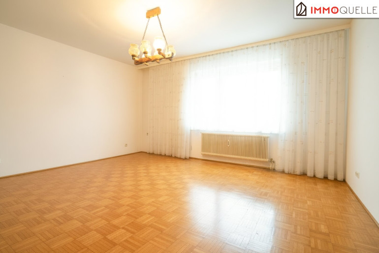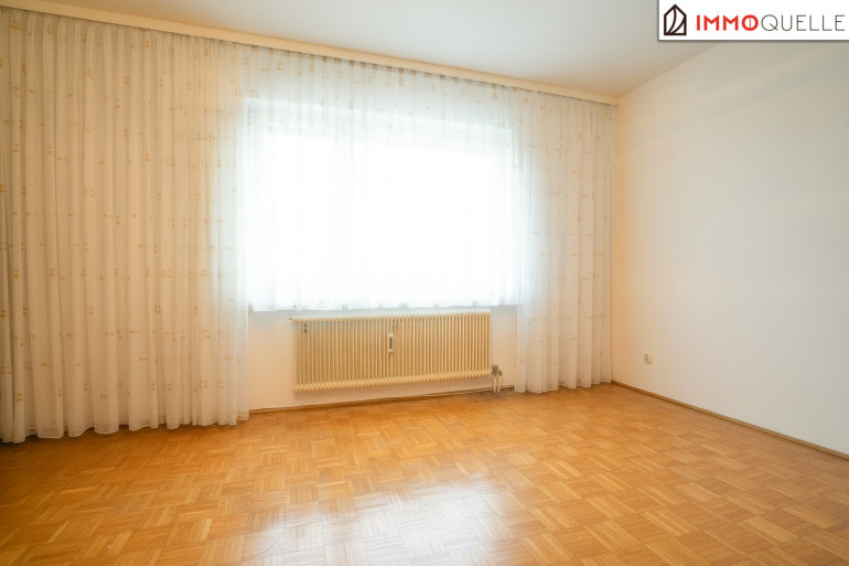 Auf der rechten Seite des Flurs entfaltet sich der private Wohnbereich - alle Räume nach Osten ausgerichtet, mit sanftem Sonnenlicht ab den frühen Morgenstunden. Zunächst das großzügige Wohnzimmer mit breiten Fensterflächen: ein heller, einladender Raum mit herrlichem Ausblick über die Dächer von Wels. Genießen Sie hier einen stillen Moment am Abend, eine Tasse Kaffee am Morgen - oder den Sonnenaufgang ganz für sich allein.