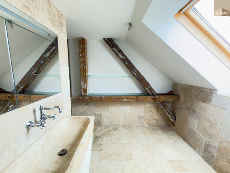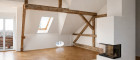 Die offene L-Form, eine Raumhöhe von über 4 Metern, sichtbare historische Dachbalken sowie Fischgrätparkett aus Eichenholz schaffen ein außergewöhnlich repräsentatives Wohnambiente.