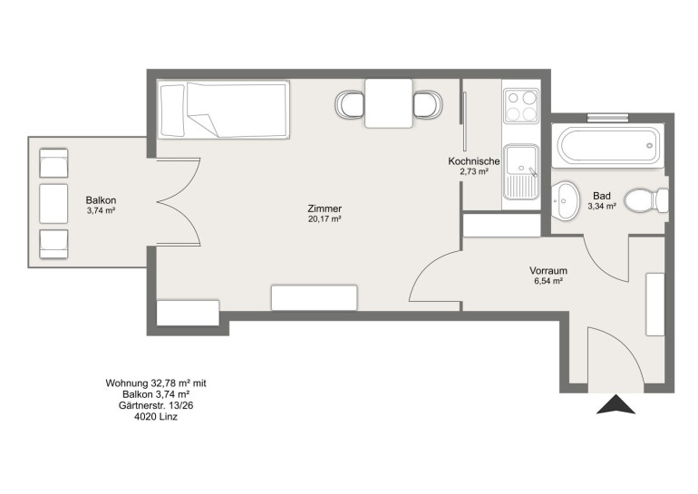 Die Wohnung befindet sich im Dachgeschoß eines Mehrfamilienhauses in der Gärtnerstraße in Linz, Oberösterreich. Sie ist nach Süden ausgerichtet und bietet somit einen schönen Ausblick in Richtung Sonne. In unmittelbarer Nähe gibt es eine Vielzahl an Versorgungsmöglichkeiten, wie Arztpraxen, Apotheken, Kliniken und ein Krankenhaus. Auch für Familien mit Kindern ist die Lage ideal, da sich ein Kindergarten, eine Schule und eine höhere Schule in der Umgebung