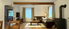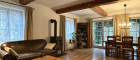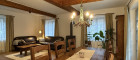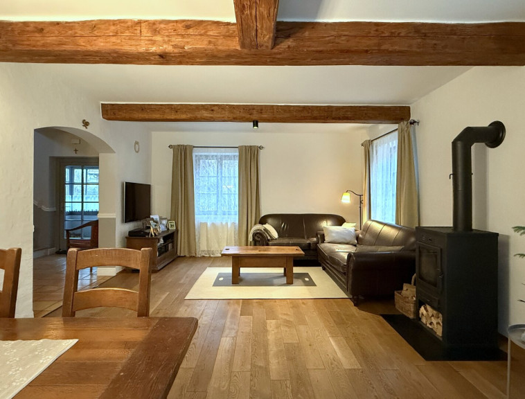 Links öffnet sich das Wohnzimmer – sofort fallen sie ins Auge: massive Deckenbalken, die dem Raum Charakter und Tiefe verleihen. Der Landhausstil ist hier nicht nur angedeutet, sondern konsequent umgesetzt, sanft ausbalanciert durch helle Farben, weiche Materialien und eine wohnliche Leichtigkeit. Viele Fensterflächen holen den Garten ins Haus, zwei Terrassentüren schaffen einen fließenden Übergang nach draußen.