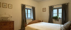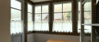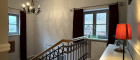 Über die Treppe gelangen Sie ins Obergeschoss. Rechter Hand ein Schlafzimmer als Eckzimmer mit zwei Fenstern, schönem Ausblick und dunklem Dielenboden – ruhig, klassisch und stimmig.