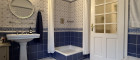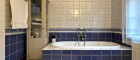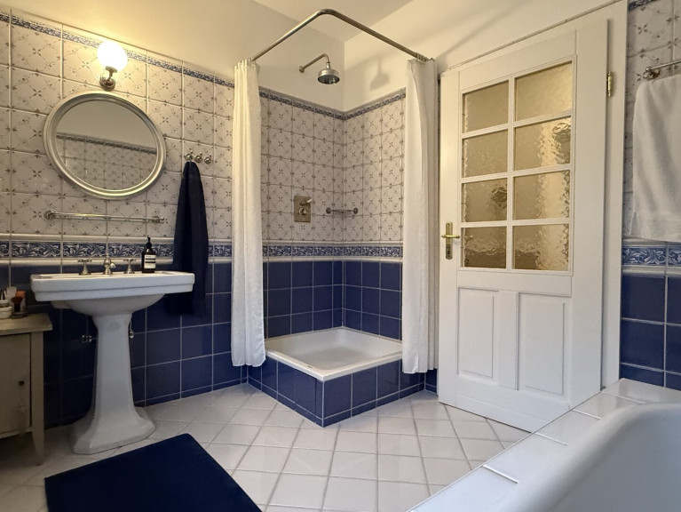 Zwischen den beiden Zimmern liegt das Badezimmer – ein Raum, der jedem ein leises Lächeln hervorruft. Blau-weiße Fliesen erzählen hier von Landhausromantik, von floraler Leichtigkeit und einer stillen Eleganz, die nie laut sein muss. Tageslicht fällt durch das große Fenster, der Blick geht auch beim Zähneputzen ins Grün – alles wirkt angenehm entschleunigt.