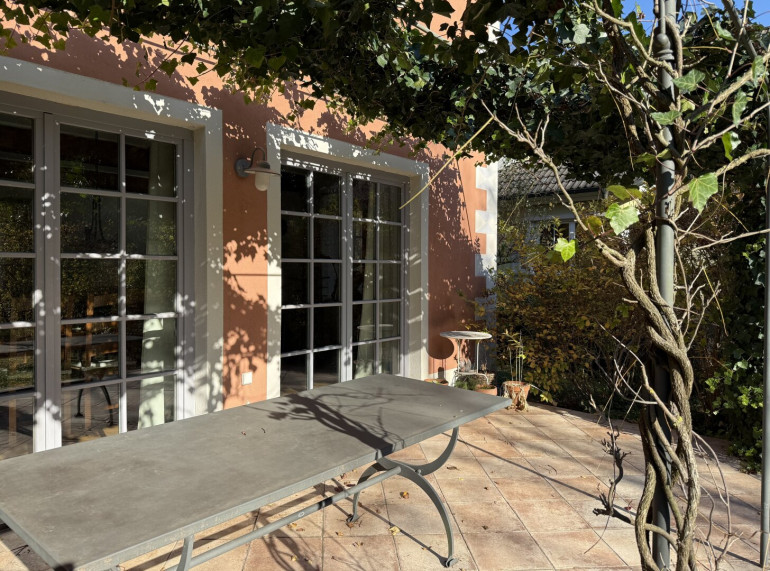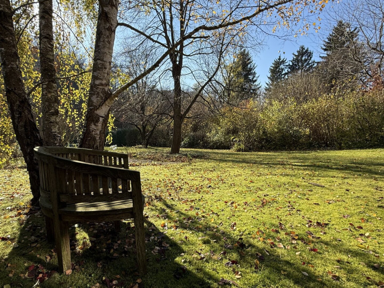 Über der Terrasse spannt sich eine Pergola, die sich im Sommer herrlich beranken lässt. Der Blick in den Garten ist schlichtweg ein Traum – man fühlt sich, als wäre man ganz allein auf der Welt. Alter Baumbestand, genau richtig dosiert: nicht zu dicht, nicht zu kahl. Nichts Strenges, nichts Geometrisches – vielmehr ein Garten, der gewachsen wirkt und sich nicht in den Vordergrund drängt.