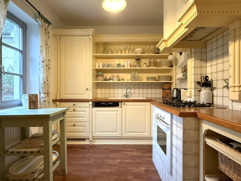 Direkt anschließend liegt die Küche. Auch hier zeigt sich der Landhausstil in seiner sanften, wohnlichen Form – hell, freundlich und nah am Geschehen. Der große Esstisch im Wohnzimmer ist nur ein paar Schritte entfernt, Gespräche und Lachen wandern mühelos hin und her. Der Blick geht auch hier in den Garten, die Familie stets im Blick. Gekocht wird auf einem professionellen Gasherd – selbstverständlich, unaufgeregt und mit Freude am Tun.