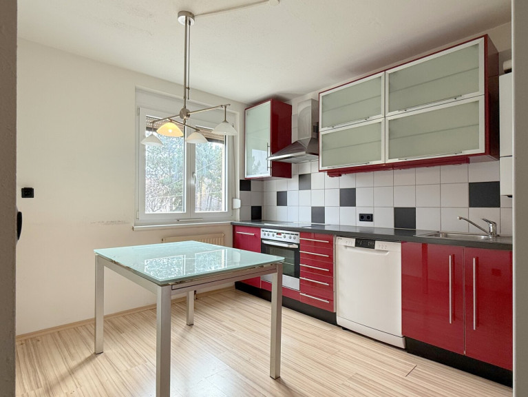 Dann geht’s ab in die Küche. Modern, ordentlich, mit roten Fronten, die genau so viel Farbe ins Spiel bringen, wie es braucht. Übersichtlich, aber mit genug Platz für ein gemütliches Frühstücksplatzerl. Durch die großen Fenster gibt’s viel zu schauen – der Blick fällt Richtung Straße und Park. Morgens Licht, tagsüber Leben, abends Atmosphäre.