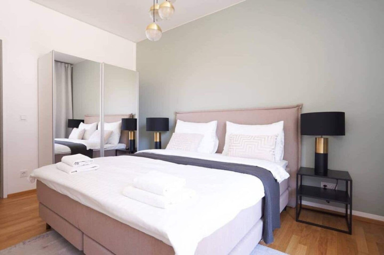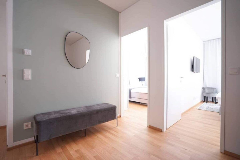 The apartment is rented fully furnished and comes fully equipped with kitchenware. High quality materials, a calm color scheme and plenty of natural daylight create a bright and pleasant living atmosphere. The two bedrooms are clearly separated and are ideal for use as a bedroom and home office or for shared living. A private basement storage unit is included.