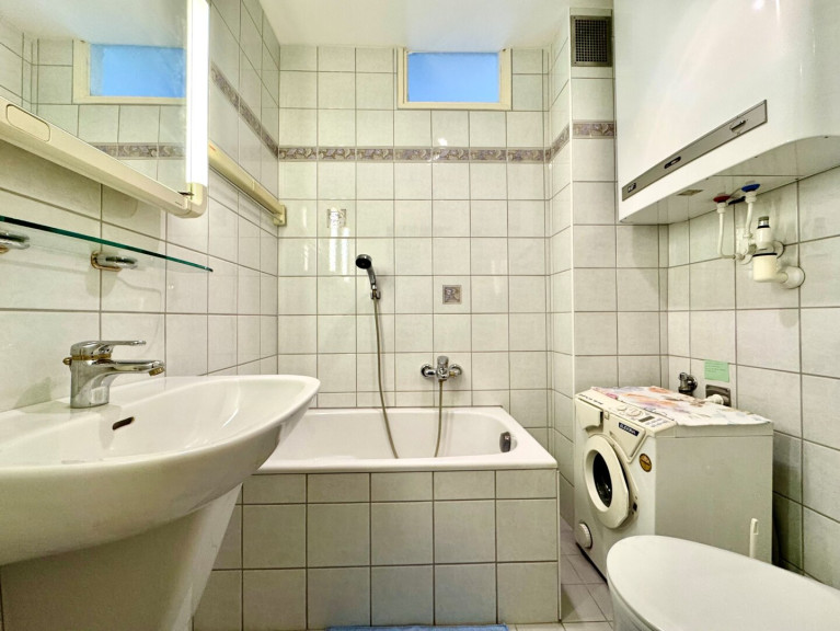 Die Wohnung gliedert sich in einen kleinen Vorraum, ein Badezimmer mit Sitzbadewanne und WC, ein Wohnzimmer mit Kochnische sowie ein kleines Schlafzimmer, welches sowohl über das Wohnzimmer erreichbar ist als auch einen direkten Ausgang auf den Balkon bietet.