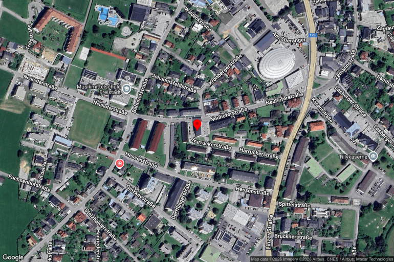 Die gegenständliche Wohnung befindet sich im 1. Obergeschoß des Wohnhauses Harruckerstraße 14 in Freistadt, welches ca. 1969 errichtet wurde. Die Lage zeichnet sich durch ihre zentrumsnahe und zugleich gut erschlossene Umgebung aus. In unmittelbarer Nähe – nur etwa 1 bis 2 Gehminuten entfernt – befinden sich zahlreiche Einrichtungen des täglichen Bedarfs, darunter die Messehalle Freistadt, eine Bushaltestelle, ein Bäcker, ein Sparmarkt, die Musikmittelschule sowie das Frei- und Hallenbad. Der historische Freistädter Stadtplatz ist in rund 17 Gehminuten bequem erreichbar und unterstreicht die attraktive Wohnlage mit urbanem Flair.