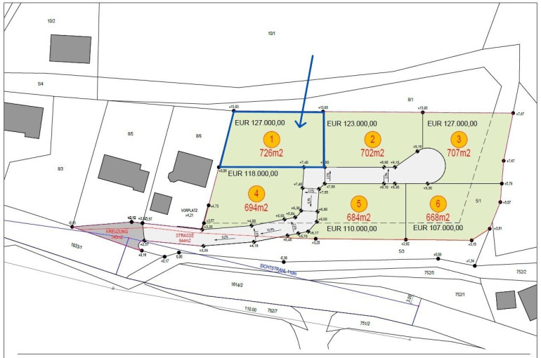 Wir freuen uns, Ihnen dieses attraktive Baugrundstück anzubieten, das Ihnen die Möglichkeit bietet, Ihr eigenes Eigenheim in einer idyllischen Umgebung zu schaffen. Mit einer großzügigen Fläche von 726 m² haben Sie ausreichend Platz, um Ihre Wohnträume zu verwirklichen und ein Zuhause zu schaffen, das ganz auf Ihre Bedürfnisse abgestimmt ist.