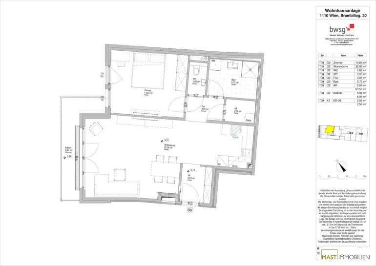 Die Wohnung befindet sich im 2. Liftstock und verfügt über 63,53 m² Wohnfläche + einen 6,94 m² großen Balkon.
