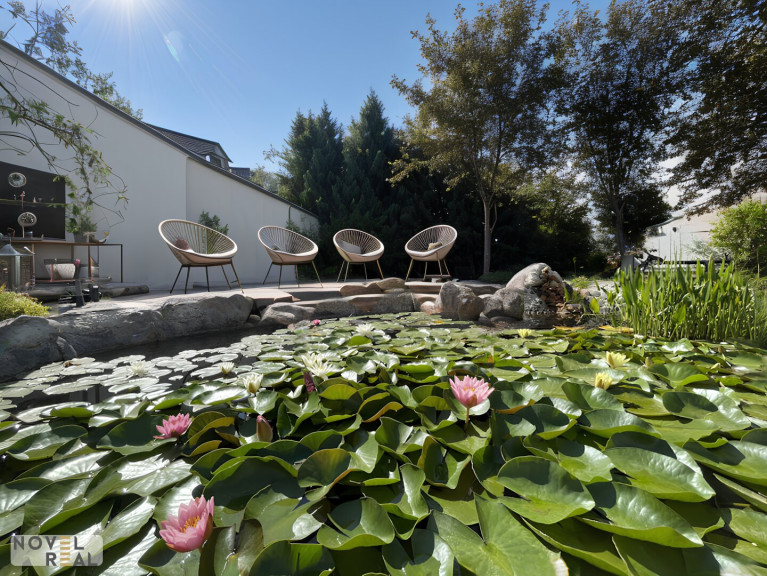 Vom Wohnzimmer aus gelangen Sie direkt auf zwei großzügige Terrassen und in den wunderschönen, 370 m² großen Garten mit einem Fischteich – ein perfekter Rückzugsort zum Entspannen und Genießen.