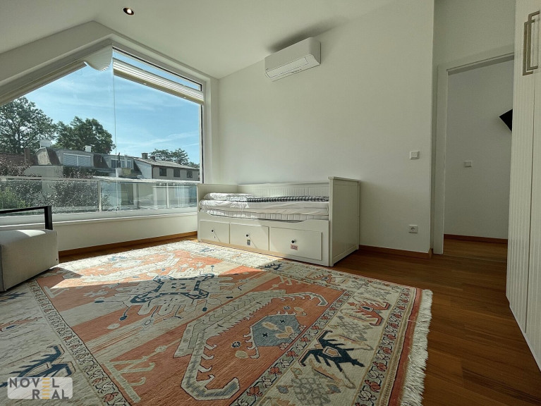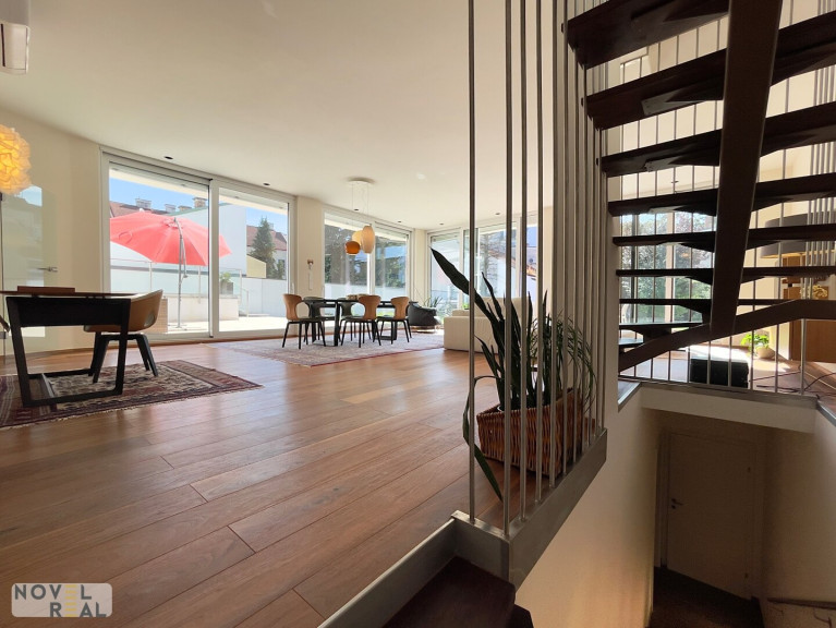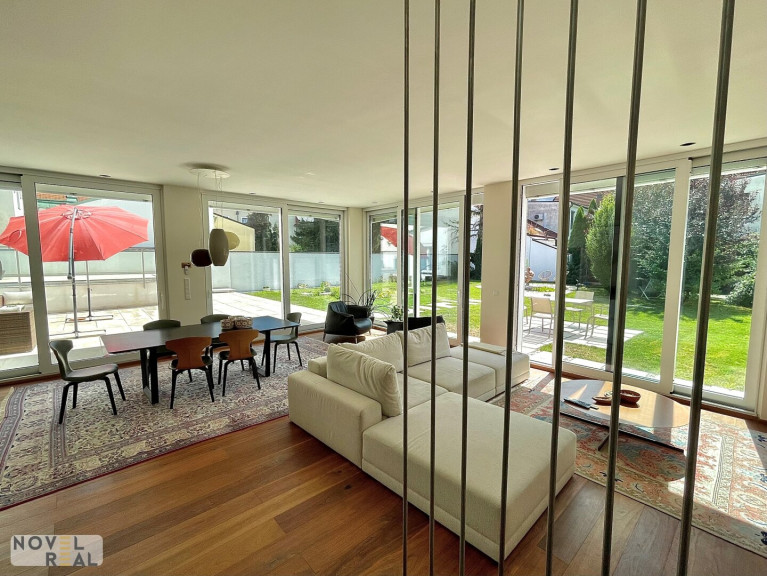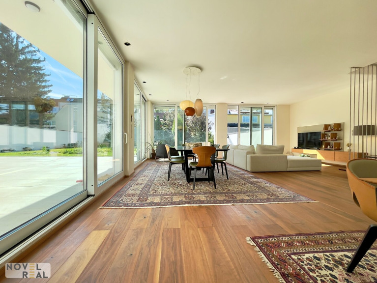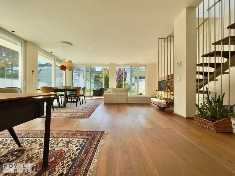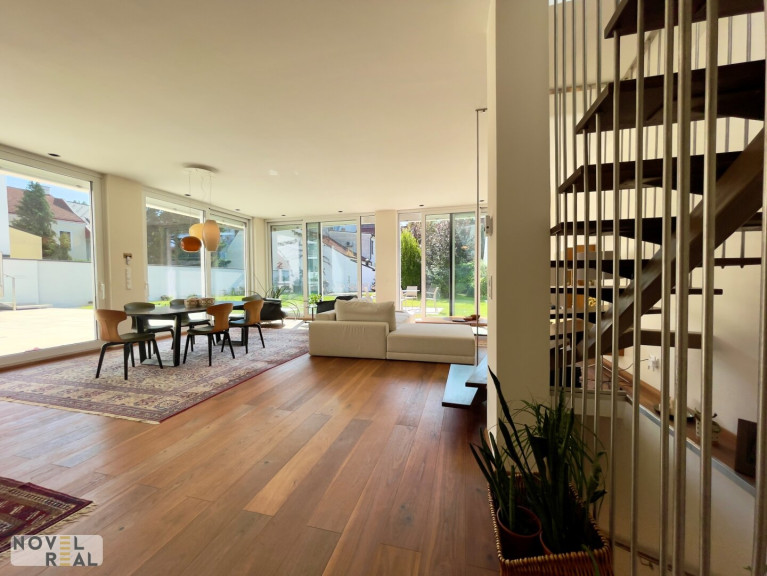 Die ca. 183 m² große Wohnfläche verteilt sich auf zwei Etagen und bietet mit vier geräumigen Zimmern viel Platz zum Leben und Wohlfühlen. Das Erdgeschoss begeistert mit einer offenen Wohnessküche von ca. 67 m², die mit hochwertigen Geräten von Gaggenau und Siemens ausgestattet ist. Der elegante Parkettboden, die klimatisierten Wohnräume und die elektrischen Außenjalousien unterstreichen den hohen Wohnkomfort.