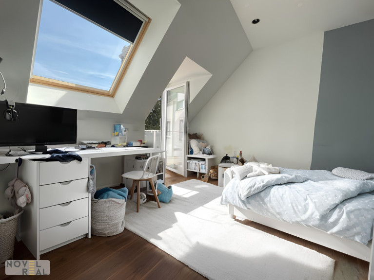 Das Obergeschoss besticht durch helle, lichtdurchflutete Räume mit großen Fenstern und einem durchgehenden Eckbalkon von 21,75 m², der von jedem Zimmer zugänglich ist. Das stilvolle Badezimmer mit freistehender Badewanne und hochwertiger Ausstattung sowie die praktischen Schrankräume runden das Angebot ab.