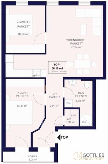Man betritt die Wohnung über den Vorraum und gelangt zentral in die gemütliche ca. 27,94 m² große Wohnküche, ein Schlafzimmer mit ca. 13,41 m² Größe und direktem Ausgang auf den ca. 3,05 m² großen Balkon, das ca. 5,70 m² große Duschbad mit Toilette sowie in den ca. 1,37 m² großen Abstellraum. Ein weiteres ca. 10,50 m² großes Schlafzimmer ist von der Wohnküche begehbar.