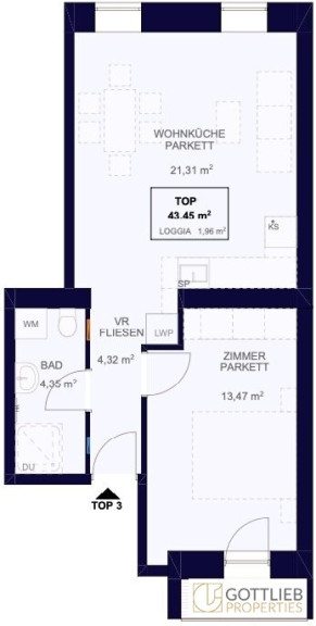 Man betritt die Wohnung über den Vorraum und gelangt zentral in die gemütliche ca. 21,31 m² große Wohnküche, das ca. 4,35 m² große Duschbad mit Toilette sowie in ein Zimmer mit ca. 13,47 m² Größe, mit direktem Ausgang auf die ca. 1,96 m² große Loggia.