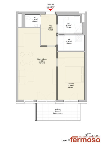 Mit zwei großzügigen Zimmern ist diese Wohnung ideal für Singles, Paare oder kleine Familien. Der offene Grundriss sorgt für ein angenehmes Raumgefühl und ermöglicht Ihnen, die Räume ganz nach Ihren Wünschen zu gestalten. Die hochwertigen Fliesen und das elegante Parkett verleihen der Wohnung einen zeitgemäßen und stilvollen Charakter.
