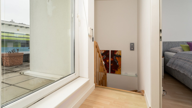 Ebenfalls gelangen Sie über den kleinen Vorraum des Obergeschoßes zur Terrasse mit viel Platz für Grillabende oder entspannte Stunden.