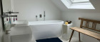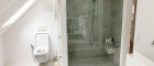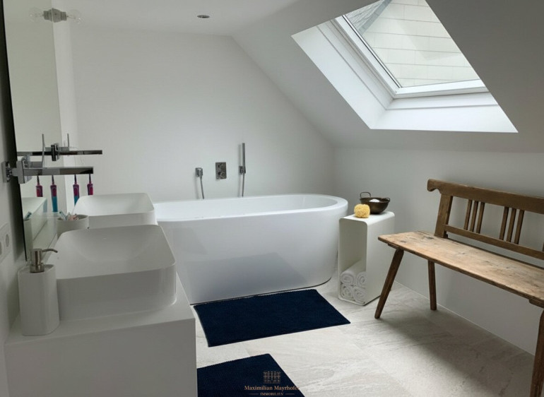 Die Badezimmer sind hochwertig ausgestattet – jeweils mit begehbarer Dusche, im Obergeschoss zusätzlich mit Badewanne, sowie eleganten Waschtischen.