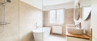 Ein modernes Badezimmer mit freistehender Badewanne und Dusche, ein separates WC, ein praktischer Abstellraum sowie ein ca. 6 m² großes Kellerabteil runden dieses attraktive Wohnangebot ab.