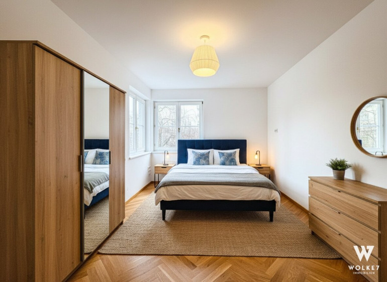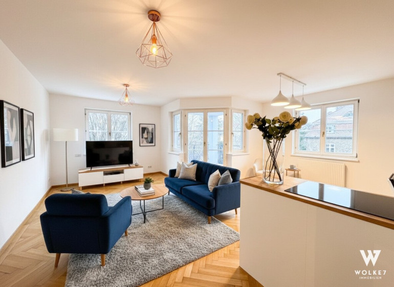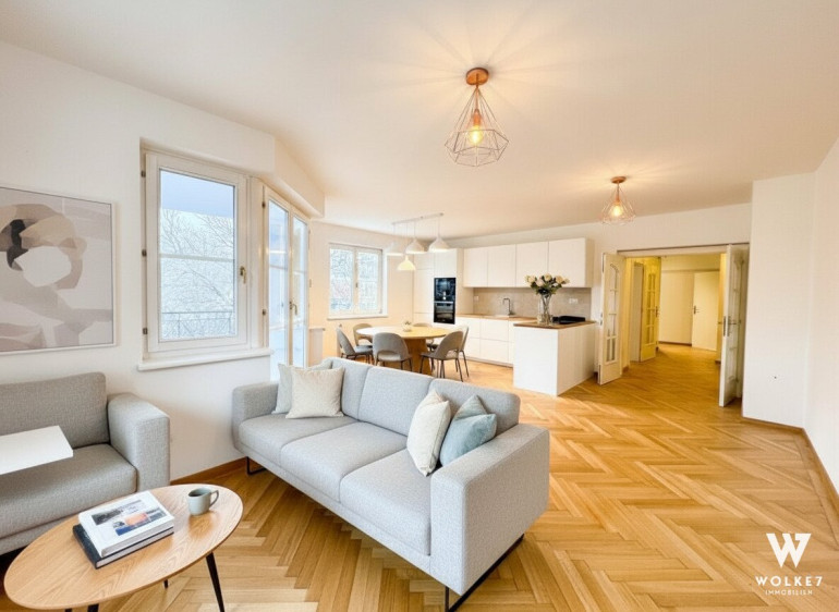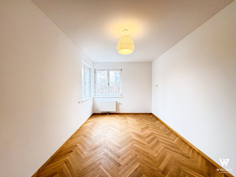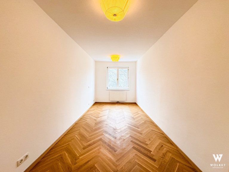 Die ca. 92 m² große Wohnung + ca. 6,8 m² Balkon überzeugt durch einen harmonischen Grundriss, 3 Zimmer, eine Raumhöhe von 2,6 m und eine Ausrichtung in drei Himmelsrichtungen, die für helle und freundliche Räume sorgt. Sie liegt im 2. Obergeschoß mit Lift, alle Räume sind zentral begehbar und mit elegantem Fischgrätparkett ausgestattet.