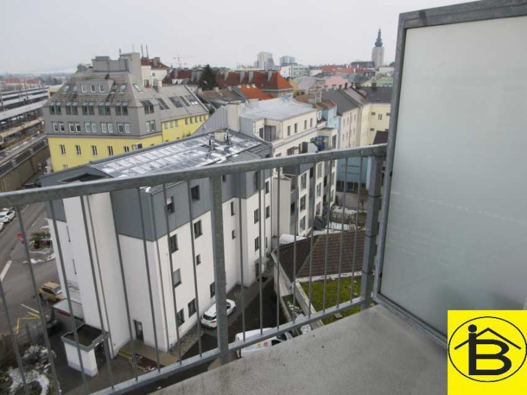 einen ca. 1,5 m² großen Balkon mit Ausblick auf die Innenstadt und auf den Bahnhof.